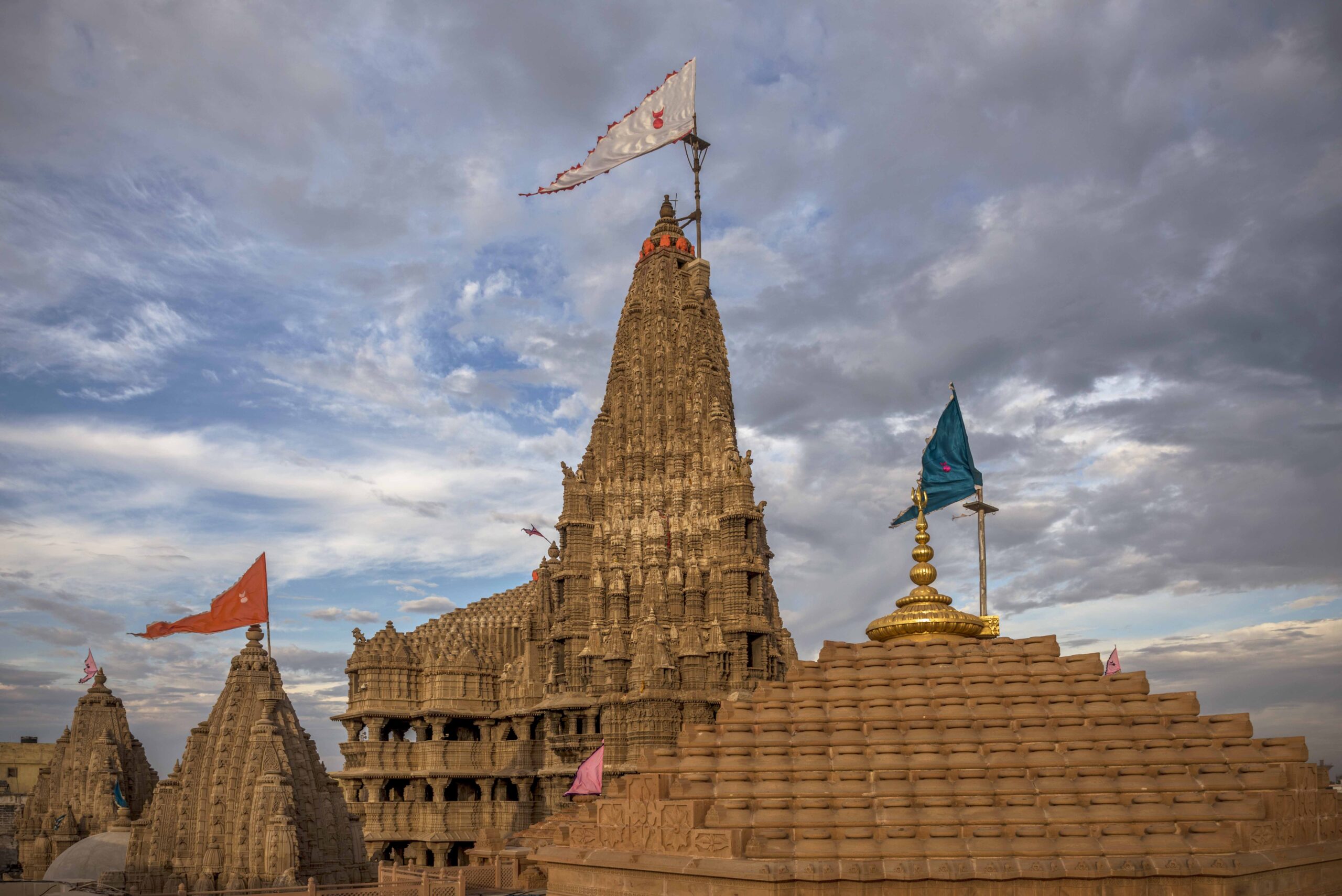 The main temple at Dwarka, situated on Gomti creek, is known as jagat mandir (universal shrine) or trilok sundar (the most beautiful in all the three worlds). Originally believed to be built by Vajranabh, the great grandson of Lord Krishna, more than 2500 years ago, it is a glorious structure seeming to rise from the waters of the Arabian Sea. Its exquisitely carved shikhar, reaching 43 m high and the huge flag made from 52 yards of cloth, can be seen from as far away as 10 km. The grandeur of the temple is enhanced by the flight of 56 steps leading to the rear side of the edifice on the side of the river Gomti. The temple is built of soft limestone and consists of a sanctum, vestibule and a rectangular hall with porches on three sides. There are two gateways: swarga dwar (gate to the heavens), where pilgrims enter, and moksha dwar (gate to liberation), where pilgrims exit.